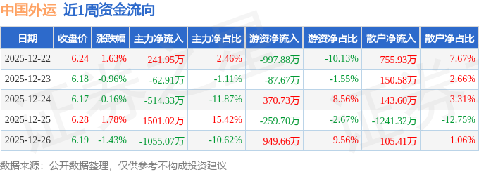 沪深股通持股方面,截止2025年12月26日收盘,中国外运沪股通持股数为1.56亿股,占流通股比为297.0%。