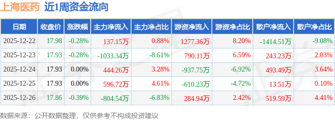 资金流向数据方面,本周上海医药主力资金合计净流出659.75万元,游资资金合计净流入804.43万元,散户资金合计净流出144.68万元。本周资金流向一览见下表: