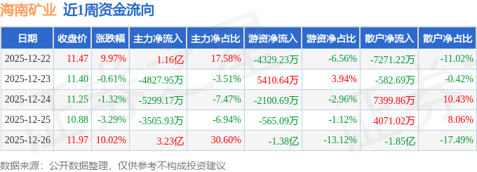 证券之星消息,截至2025年12月26日收盘,海南矿业(601969)报收于11.97元,较上周的10.43元上涨14.77%。本周,海南矿业12月23日盘中最高价报12.25元。12月22日盘中最低价报10.62元。本周共计2次涨停收盘,无跌停收盘情况。海南矿业当前最新总市值237.39亿元,在冶钢原料板块市值排名4/9,在两市A股市值排名824/5181。