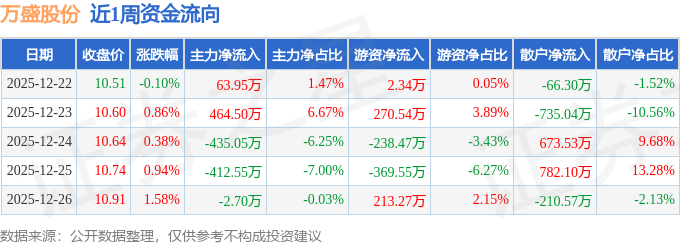 资金流向数据方面,本周万盛股份主力资金合计净流出321.86万元,游资资金合计净流出121.87万元,散户资金合计净流入443.73万元。本周资金流向一览见下表:
