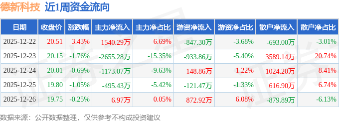 资金流向数据方面,本周德新科技主力资金合计净流出2776.51万元,游资资金合计净流出880.84万元,散户资金合计净流入3657.36万元。本周资金流向一览见下表: