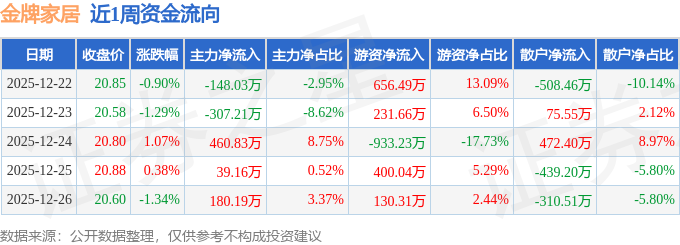 资金流向数据方面,本周金牌家居主力资金合计净流入224.94万元,游资资金合计净流入485.27万元,散户资金合计净流出710.21万元。本周资金流向一览见下表: