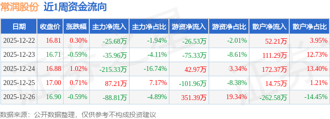 资金流向数据方面,本周常润股份主力资金合计净流出278.57万元,游资资金合计净流入190.54万元,散户资金合计净流入88.03万元。本周资金流向一览见下表: