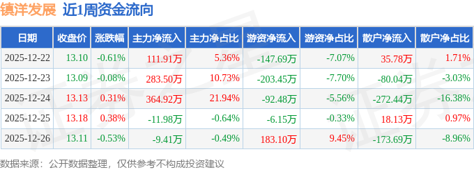 证券之星消息,截至2025年12月26日收盘,镇洋发展(603213)报收于13.11元,较上周的13.18元下跌0.53%。本周,镇洋发展12月26日盘中最高价报13.25元。12月23日盘中最低价报12.98元。镇洋发展当前最新总市值58.03亿元,在化学原料板块市值排名33/57,在两市A股市值排名2994/5181。