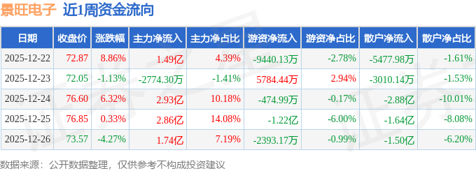 资金流向数据方面,本周景旺电子主力资金合计净流入8.74亿元,游资资金合计净流出1.87亿元,散户资金合计净流出6.87亿元。本周资金流向一览见下表: