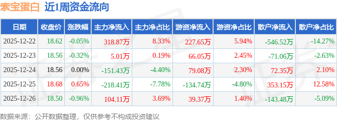 资金流向数据方面,本周索宝蛋白主力资金合计净流入58.14万元,游资资金合计净流入277.41万元,散户资金合计净流出335.56万元。本周资金流向一览见下表: