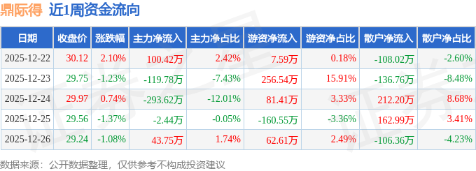 资金流向数据方面,本周鼎际得主力资金合计净流出271.67万元,游资资金合计净流入247.61万元,散户资金合计净流入24.06万元。本周资金流向一览见下表: