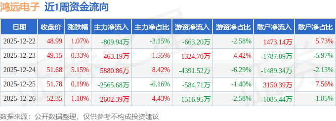 资金流向数据方面,本周鸿远电子主力资金合计净流入5570.82万元,游资资金合计净流出5831.68万元,散户资金合计净流入260.86万元。本周资金流向一览见下表: