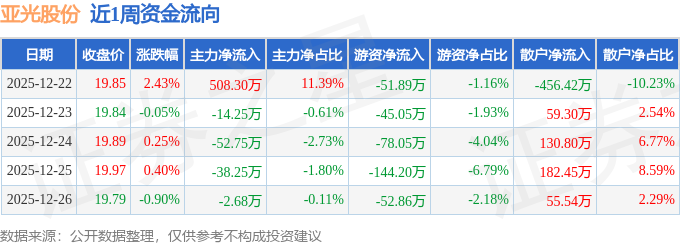 资金流向数据方面,本周亚光股份主力资金合计净流入400.37万元,游资资金合计净流出372.04万元,散户资金合计净流出28.33万元。本周资金流向一览见下表: