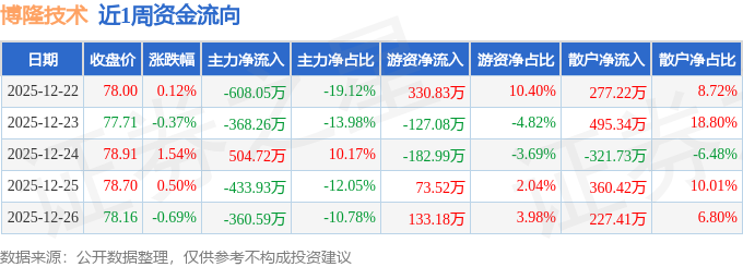 资金流向数据方面,本周博隆技术主力资金合计净流出1266.11万元,游资资金合计净流入227.44万元,散户资金合计净流入1038.66万元。本周资金流向一览见下表: