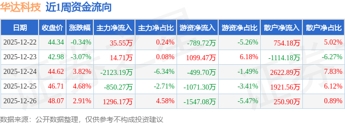 沪深股通持股方面,截止2025年12月26日收盘,华达科技沪股通持股数为96.75万股,占流通股比为22.0%。