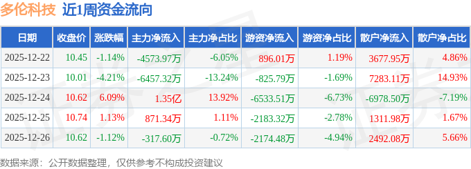 资金流向数据方面,本周多伦科技主力资金合计净流入3034.46万元,游资资金合计净流出1.08亿元,散户资金合计净流入7786.62万元。本周资金流向一览见下表: