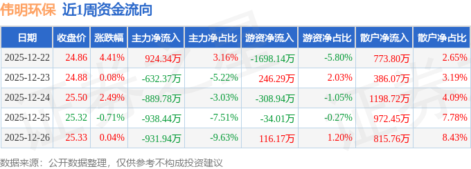 沪深股通持股方面,截止2025年12月26日收盘,伟明环保沪股通持股数为2815.63万股,占流通股比为166.0%。