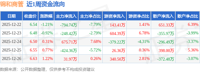 资金流向数据方面,本周锦和商管主力资金合计净流出759.84万元,游资资金合计净流入735.45万元,散户资金合计净流入24.39万元。本周资金流向一览见下表: