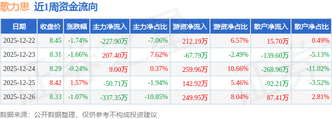 资金流向数据方面,本周歌力思主力资金合计净流出399.57万元,游资资金合计净流入797.22万元,散户资金合计净流出397.66万元。本周资金流向一览见下表: