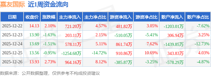 资金流向数据方面,本周嘉友国际主力资金合计净流入1211.89万元,游资资金合计净流入1358.5万元,散户资金合计净流出2570.39万元。本周资金流向一览见下表: