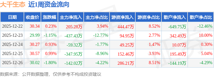 资金流向数据方面,本周大千生态主力资金合计净流出781.44万元,游资资金合计净流入1027.34万元,散户资金合计净流出245.9万元。本周资金流向一览见下表: