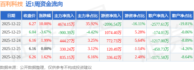资金流向数据方面,本周百利科技主力资金合计净流入5383.43万元,游资资金合计净流入207.5万元,散户资金合计净流出5590.93万元。本周资金流向一览见下表: