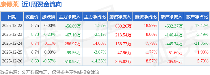资金流向数据方面,本周康德莱主力资金合计净流出447.56万元,游资资金合计净流入1414.56万元,散户资金合计净流出967.0万元。本周资金流向一览见下表: