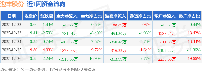 资金流向数据方面,本周迎丰股份主力资金合计净流出1331.63万元,游资资金合计净流出713.67万元,散户资金合计净流入2045.3万元。本周资金流向一览见下表: