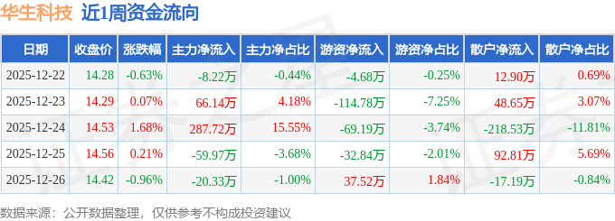 资金流向数据方面,本周华生科技主力资金合计净流入265.33万元,游资资金合计净流出183.97万元,散户资金合计净流出81.36万元。本周资金流向一览见下表: