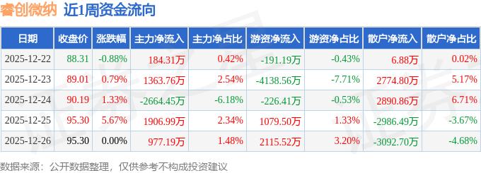 资金流向数据方面,本周睿创微纳主力资金合计净流入1767.8万元,游资资金合计净流出1361.15万元,散户资金合计净流出406.65万元。本周资金流向一览见下表: