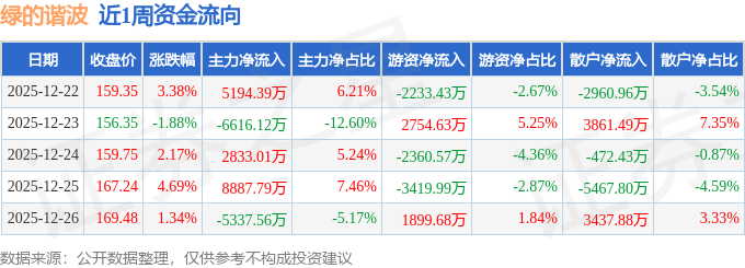 资金流向数据方面,本周绿的谐波主力资金合计净流入4961.51万元,游资资金合计净流出3359.68万元,散户资金合计净流出1601.83万元。本周资金流向一览见下表: