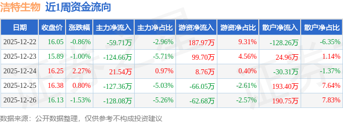 资金流向数据方面,本周洁特生物主力资金合计净流出418.26万元,游资资金合计净流入167.71万元,散户资金合计净流入250.55万元。本周资金流向一览见下表: