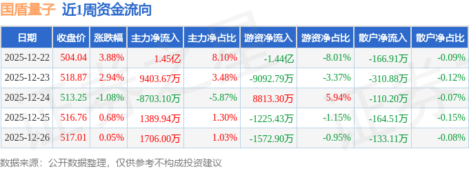 资金流向数据方面,本周国盾量子主力资金合计净流入1.83亿元,游资资金合计净流出1.74亿元,散户资金合计净流出885.6万元。本周资金流向一览见下表: