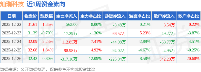 资金流向数据方面,本周灿瑞科技主力资金合计净流出122.68万元,游资资金合计净流出300.06万元,散户资金合计净流入422.73万元。本周资金流向一览见下表:
