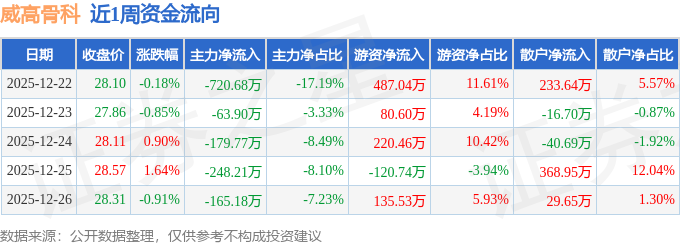 资金流向数据方面,本周威高骨科主力资金合计净流出1377.74万元,游资资金合计净流入802.89万元,散户资金合计净流入574.84万元。本周资金流向一览见下表: