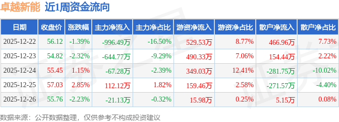 资金流向数据方面,本周卓越新能主力资金合计净流出1617.55万元,游资资金合计净流入1544.33万元,散户资金合计净流入73.23万元。本周资金流向一览见下表: