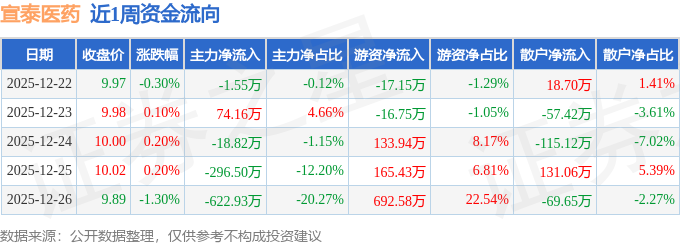 资金流向数据方面,本周宣泰医药主力资金合计净流出865.63万元,游资资金合计净流入958.06万元,散户资金合计净流出92.43万元。本周资金流向一览见下表: