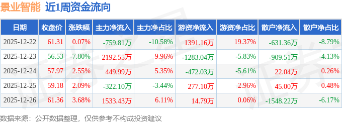 资金流向数据方面,本周景业智能主力资金合计净流入3094.06万元,游资资金合计净流出72.01万元,散户资金合计净流出3022.05万元。本周资金流向一览见下表: