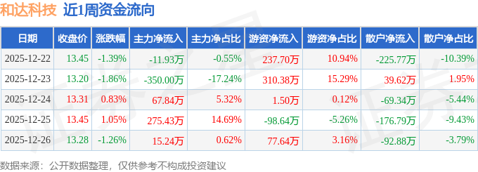 资金流向数据方面,本周和达科技主力资金合计净流出3.43万元,游资资金合计净流入528.58万元,散户资金合计净流出525.15万元。本周资金流向一览见下表: