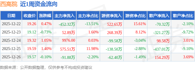 资金流向数据方面,本周西高院主力资金合计净流入85.19万元,游资资金合计净流入490.54万元,散户资金合计净流出575.74万元。本周资金流向一览见下表: