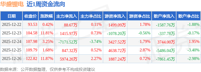 资金流向数据方面,本周华盛锂电主力资金合计净流入1154.64万元,游资资金合计净流入1.04亿元,散户资金合计净流出1.15亿元。本周资金流向一览见下表: