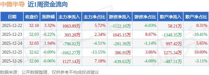 资金流向数据方面,本周中微半导主力资金合计净流入35.93万元,游资资金合计净流出531.04万元,散户资金合计净流入495.11万元。本周资金流向一览见下表: