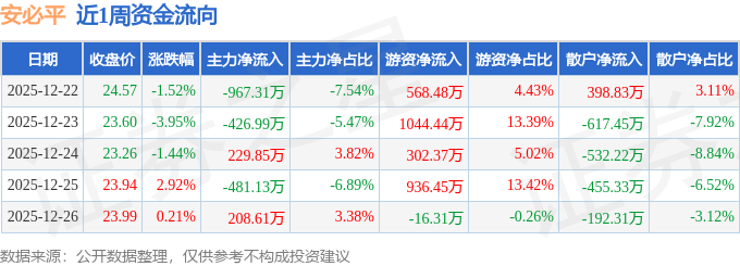 资金流向数据方面,本周安必平主力资金合计净流出1436.96万元,游资资金合计净流入2835.43万元,散户资金合计净流出1398.47万元。本周资金流向一览见下表: