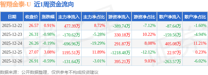 资金流向数据方面,本周智翔金泰主力资金合计净流入673.68万元,游资资金合计净流出590.96万元,散户资金合计净流出82.72万元。本周资金流向一览见下表:
