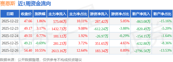资金流向数据方面,本周赛恩斯主力资金合计净流入5083.89万元,游资资金合计净流入183.2万元,散户资金合计净流出5267.09万元。本周资金流向一览见下表: