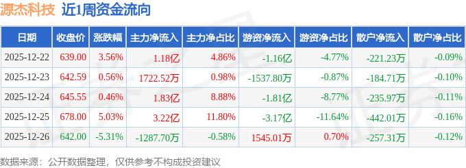 资金流向数据方面,本周源杰科技主力资金合计净流入6.27亿元,游资资金合计净流出6.14亿元,散户资金合计净流出1341.24万元。本周资金流向一览见下表:
