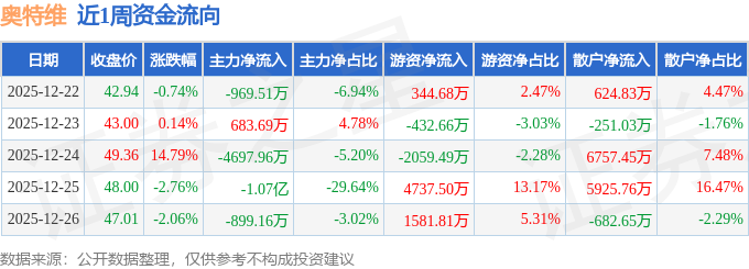 资金流向数据方面,本周奥特维主力资金合计净流出1.65亿元,游资资金合计净流入4171.83万元,散户资金合计净流入1.24亿元。本周资金流向一览见下表: