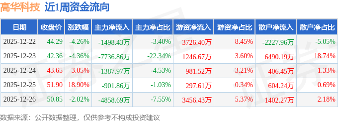 资金流向数据方面,本周高华科技主力资金合计净流出1.64亿元,游资资金合计净流入9708.63万元,散户资金合计净流入6675.18万元。本周资金流向一览见下表: