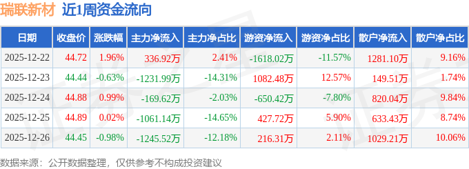 资金流向数据方面,本周瑞联新材主力资金合计净流出3371.35万元,游资资金合计净流出541.94万元,散户资金合计净流入3913.29万元。本周资金流向一览见下表: