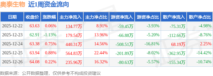 资金流向数据方面,本周奥泰生物主力资金合计净流入1555.42万元,游资资金合计净流出917.36万元,散户资金合计净流出638.06万元。本周资金流向一览见下表: