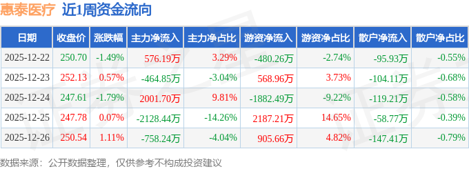 沪深股通持股方面,截止2025年12月26日收盘,惠泰医疗沪股通持股数为425.73万股,占流通股比为437.0%。