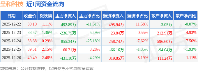 资金流向数据方面,本周呈和科技主力资金合计净流出1855.88万元,游资资金合计净流入1032.22万元,散户资金合计净流入823.66万元。本周资金流向一览见下表:
