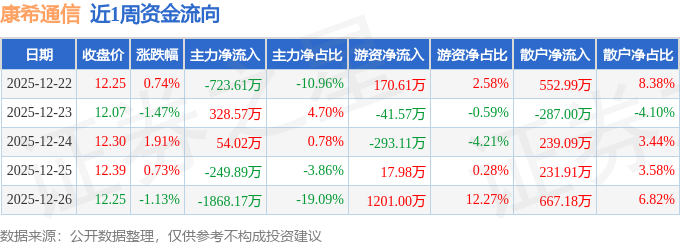 资金流向数据方面,本周康希通信主力资金合计净流出2459.08万元,游资资金合计净流入1054.91万元,散户资金合计净流入1404.18万元。本周资金流向一览见下表:
