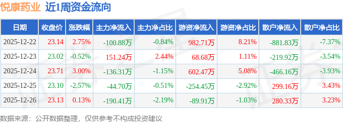 资金流向数据方面,本周悦康药业主力资金合计净流出321.07万元,游资资金合计净流入1309.5万元,散户资金合计净流出988.43万元。本周资金流向一览见下表: